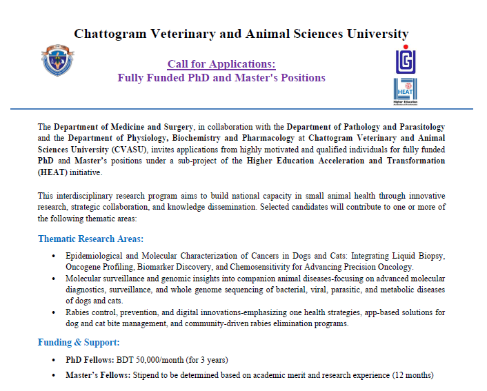 The Department of Medicine and Surgery, in collaboration with the Department of Pathology and Parasitology and the Department of Physiology, Biochemistry and Pharmacology at Chattogram Veterinary and Animal Sciences University (CVASU), invites applications from highly motivated and qualified individuals for fully funded PhD and Master’s positions under a sub-project of the Higher Education Acceleration and Transformation (HEAT) initiative.